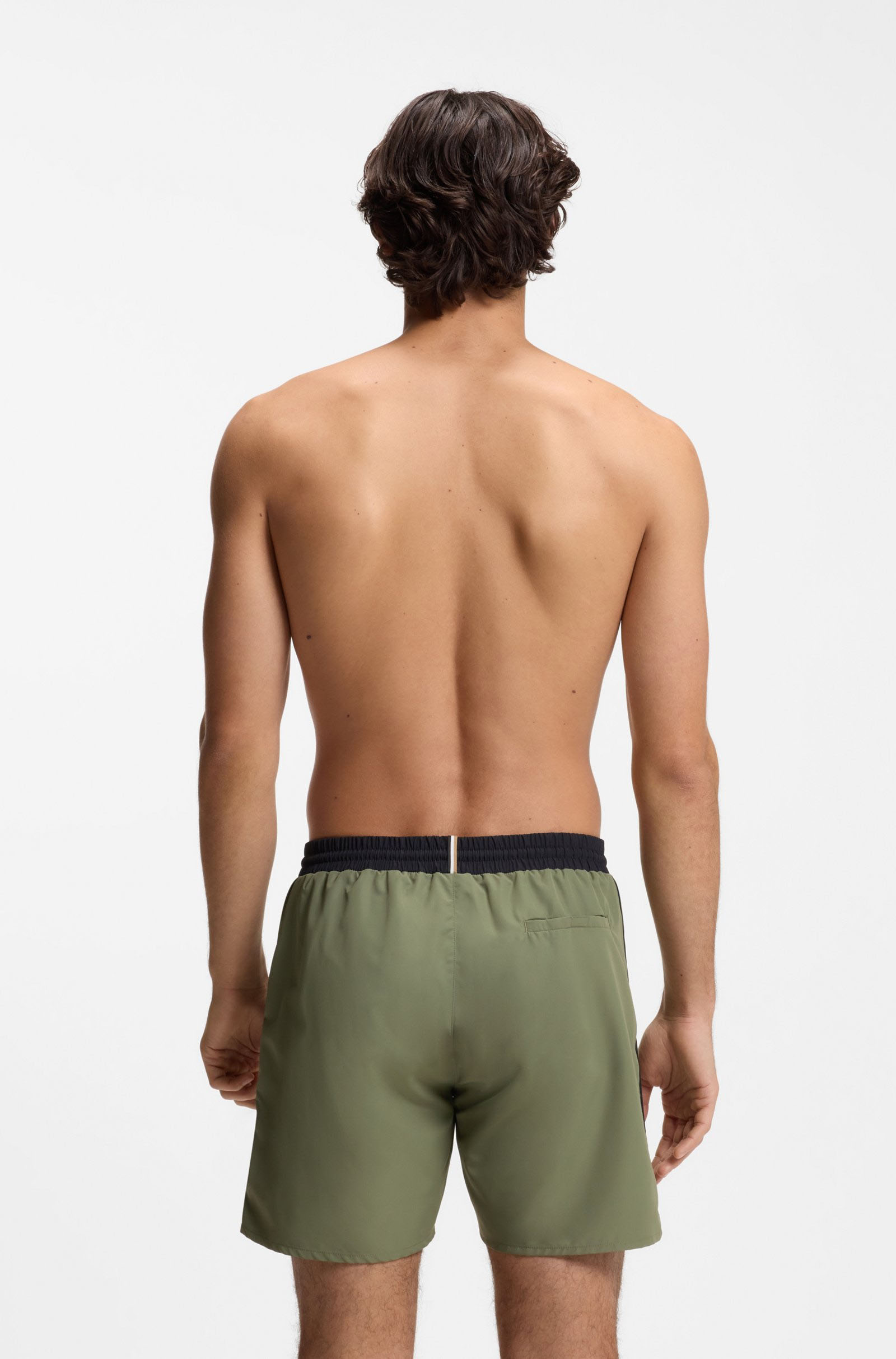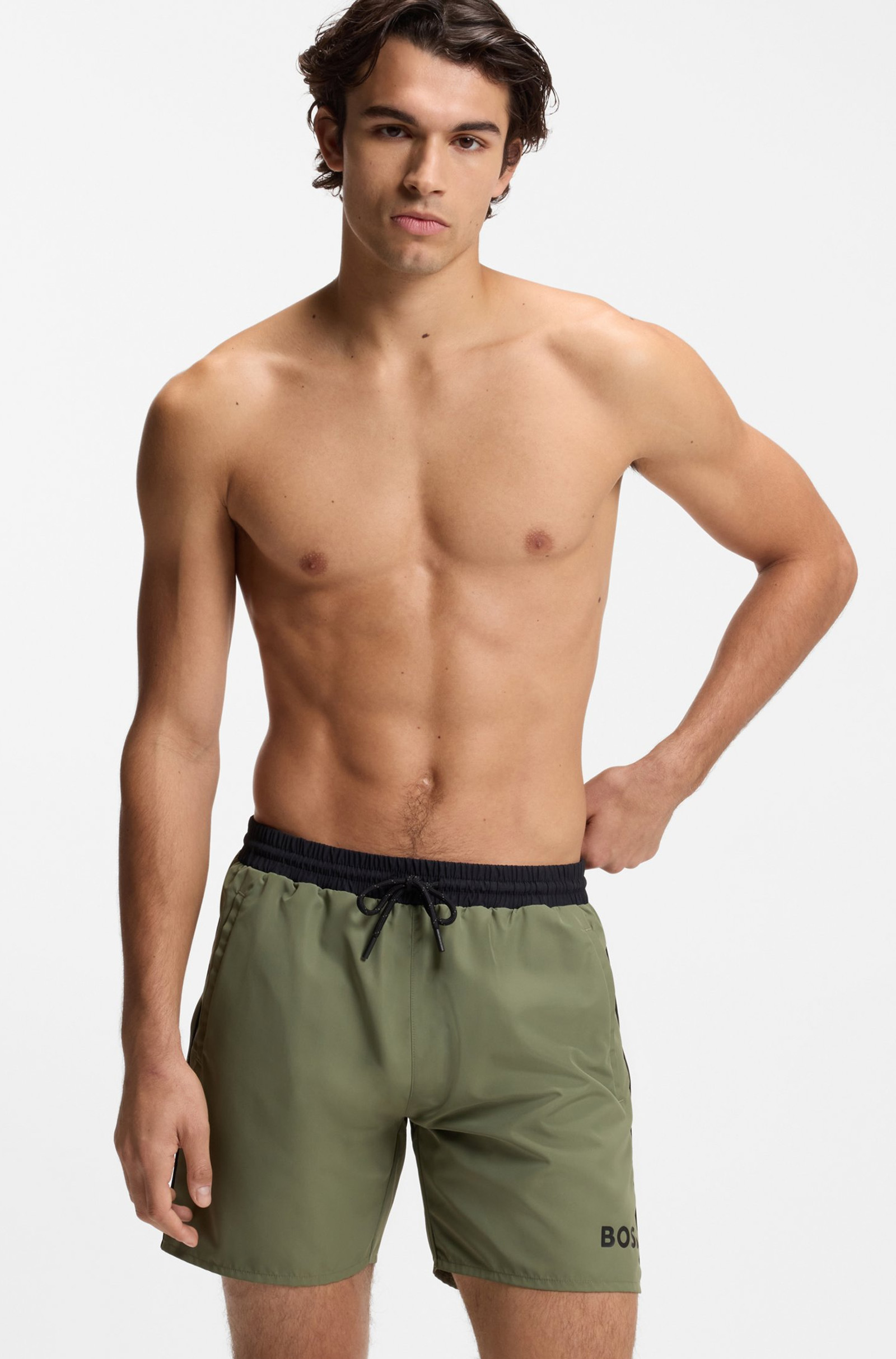 De zwembroek is effen van kleur en voorzien van het herkenbare BOSS-logo onderaan de linker pijp. Een subtiele bies langs de zijkant geeft de short een sportieve uitstraling. De zwembroek heeft een comfortabele tailleband met koordsluiting en een geïntegreerd binnenbroekje voor extra ondersteuning. Praktische steekzakken aan de zijkanten en een klein achterzakje bieden ruimte voor kleine items.